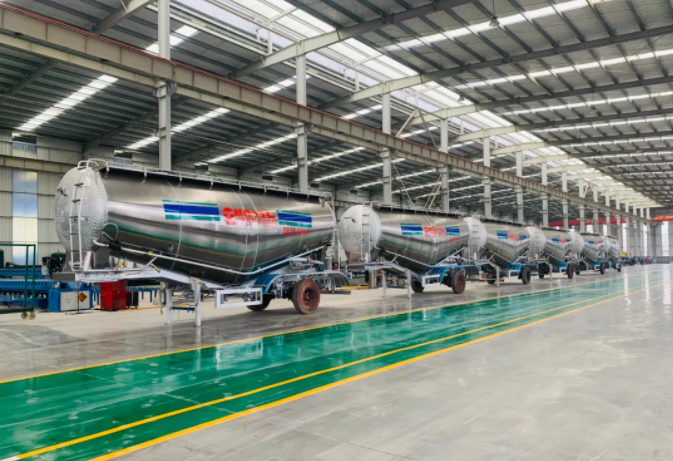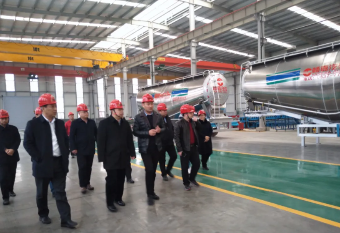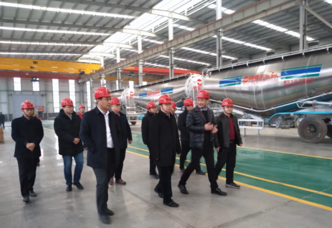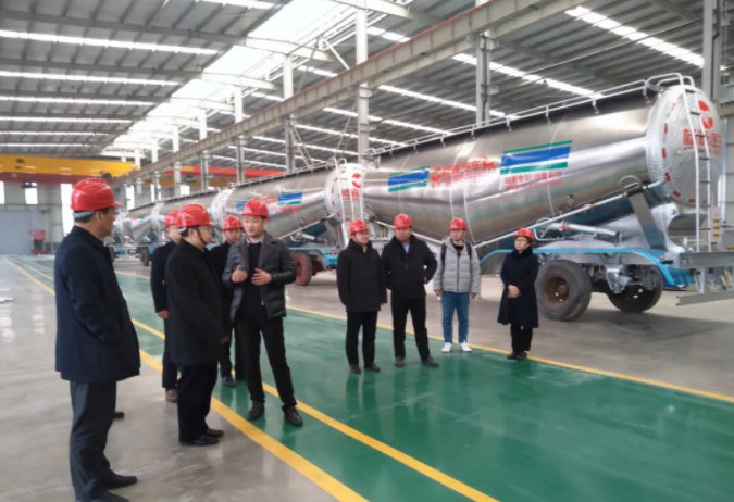 在铝合金粉罐车生产车间,公司董事长杨合连、副总经理毛雪亮简要介绍了公司运行情况及铝合金粉罐车生产线建设情况。